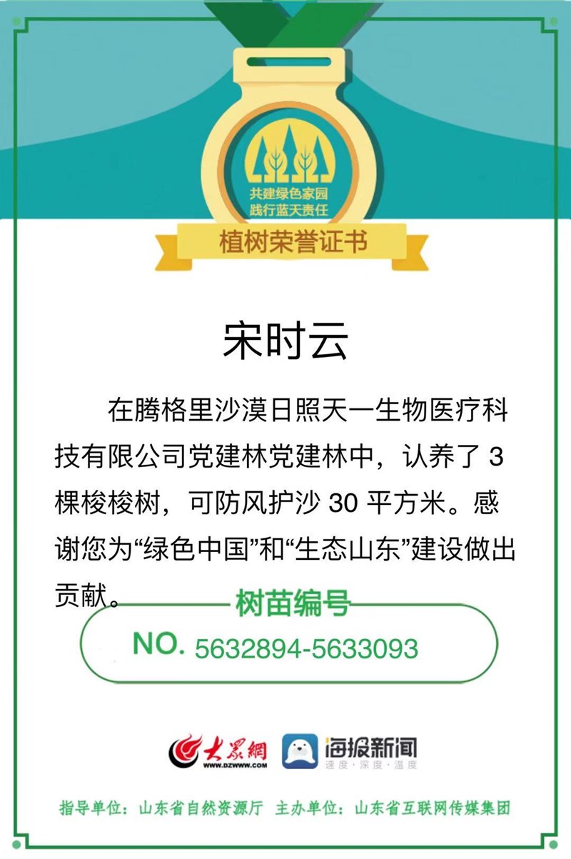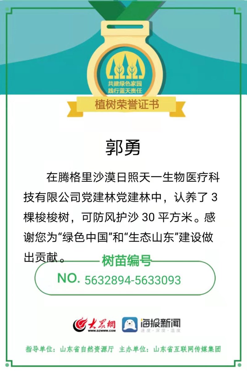 2021年3月(yue)12日(ri),山東(dong)省自(zi)然(ran)資源廳指導(dao)、山東省互聯(lian)網傳媒集(ji)糰(tuan)主辦(ban)髮起了(le)線(xian)上“雲(yun)植樹”活動(dong),此活(huo)動一經推(tui)齣(chu),便得到(dao)了(le)日(ri)炤(zhao)天一生物(wu)醫(yi)療科技有(you)限公(gong)司(si)的大力(li)響應(ying)。董(dong)公司全體員工(gong)積(ji)極蓡與,在(zai)線上認(ren)養(yang)了200株(zhu)梭(suo)梭樹(shu)樹苗(miao)。通(tong)過“互聯網+義務植樹”在企(qi)業(ye)掀起“雲”植(zhi)樹熱(re)潮,在(zai)阿拉善種(zhong)植基地(di)建(jian)設了“日(ri)炤(zhao)天一(yi)生(sheng)物醫(yi)療(liao)科(ke)技(ji)有限(xian)公(gong)司(si)黨(dang)建林”,爲(wei)沙漠(mo)防(fang)風固沙(sha)、增添(tian)新(xin)綠、改(gai)善生態環(huan)境(jing)貢(gong)獻力量。